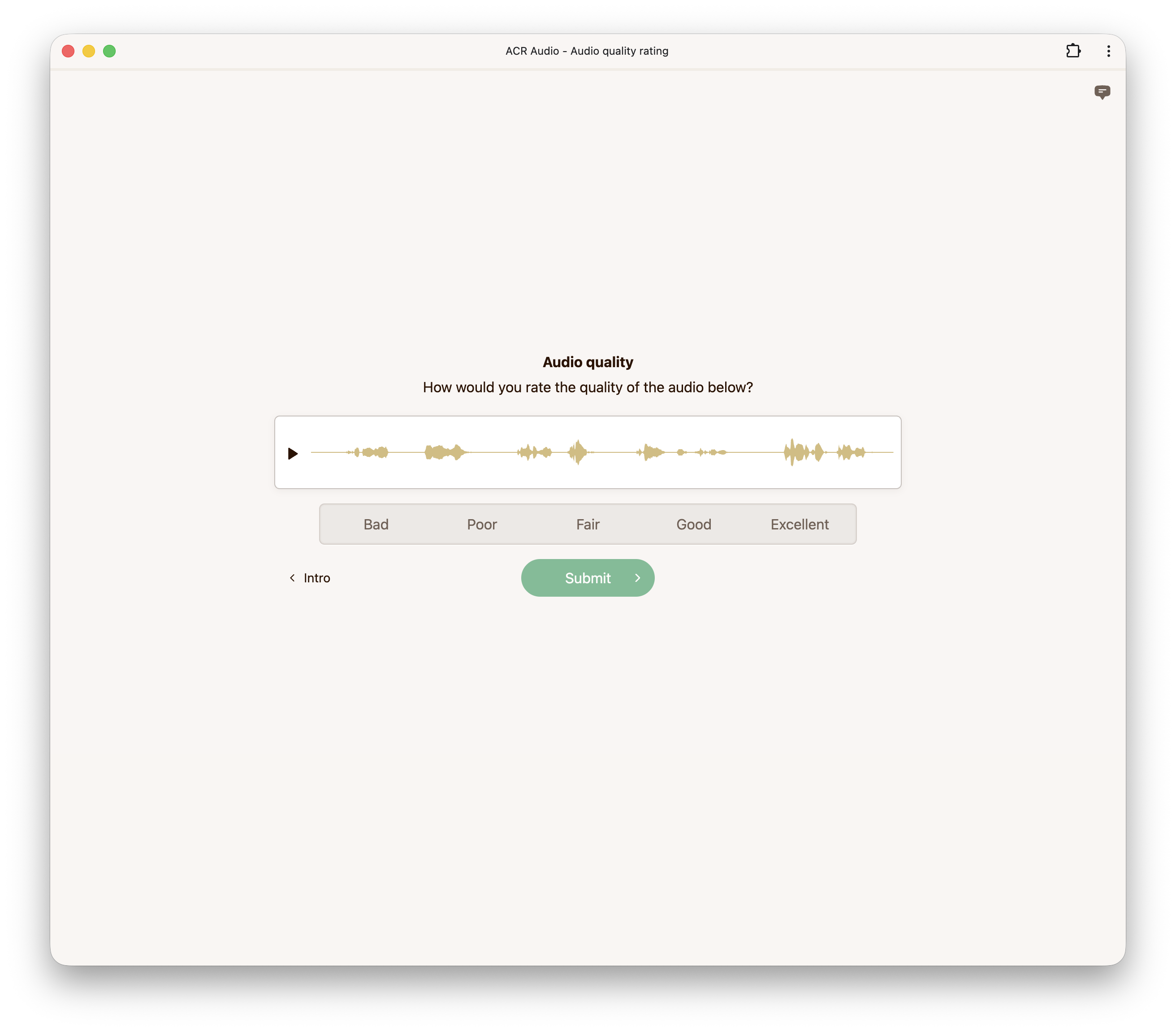 The Absolute Category Rating (ACR) audio experiment presents raters with individual audio stimuli and asks them to rate each one on a categorical quality scale. ACR is a widely used methodology standardized in ITU-T P.910 for evaluating speech and audio quality.