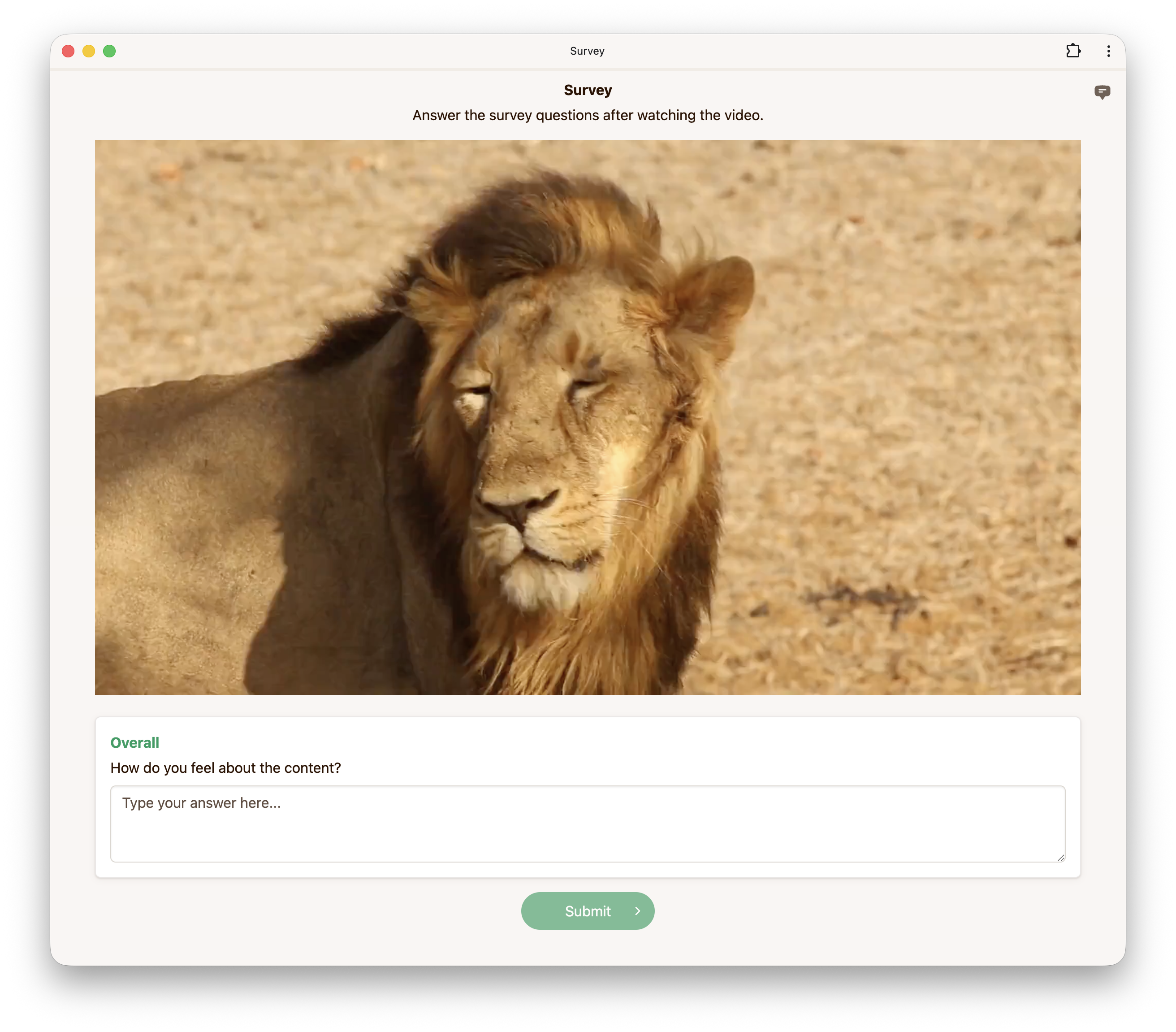 The survey video experiment presents raters with individual video stimuli and asks them to answer custom survey questions about each one. Unlike ACR video where raters select a score from a fixed category scale, the survey experiment supports open-ended text responses, single-choice (radio), and multiple-choice (checkbox) questions.